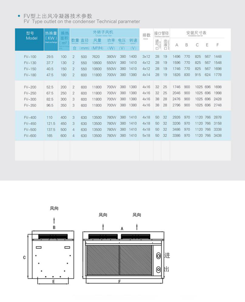 2、采(cǎi)用頂出風形式,換熱(rè)受風向變化幹擾小,適用冷 量範圍(wéi)廣。